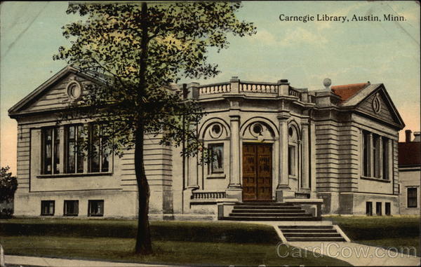 Front: Carnegie Library, Austin, Minn. Back: BLOOM BROS MINNES POLIS and Island Possessions Cuba, Canada and MESSAGE MAY BE WRITTEN ON THIS SIDE, 3785 A-16190