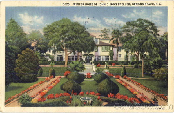 Front: D-123 WINTER HOME OF JOHN D. ROCKEFELLER, ORMOND BEACH, FLA. 3A-H880 Back: "C.T.AR |- ED SI PO 6 PM OINT FLAS SAVES TIME un look Jota di me POST GARDS bome just not 1031 do of you think mw. B Ross inrited me over Brusport ny 쨰 macher yet love