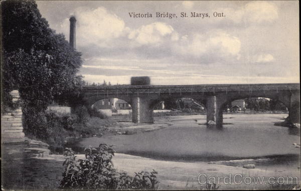 Front: Victoria Bridge, St. Marys, Ont. Back: pomp smp COSTAGE PRIVATE POST CARD. NE Slevo os 62 2e are Happy Bose d da to Miss E. r. Hennes unk again. I am 4008 Sospech are Ludy fiel y love, A Heather cond Cleveland mipiring Chis ہا bug have had
