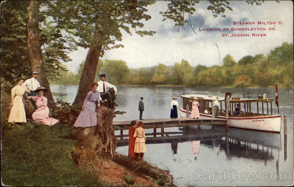 Front: STEAMER MILTON D. LANDING AT SOMERLEYTON ON ST. JOSEPH RIVER MILTON &. Back: FOR ADDRESS CYLY Publ. by Burkhard Bros., St. Joseph, Mich. No. 40.