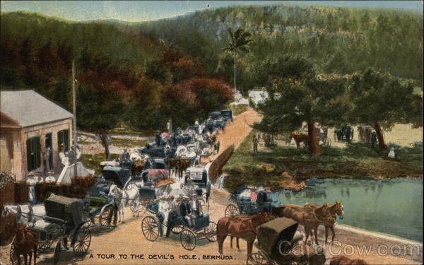 Front: A TOUR TO THE DEVIL'S HOLE, BERMUDA. Back: No. 74 Published by the Bermuda Drug Co., Prescription Druggists, Hamilton, Bermuda, FOR ADDRESS. CARD. Affix