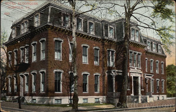 Front: HOTEL ALGONQUIN, NORFOLK, VA 6241 Back: P: the Stamp Here Post Care 91 < JUL 37 t -PM 1909 2012 A, C. Bossolman & Co., New York. 1/3.09. og 14 Mero penyu Cety Jackson St Jaces Ray Juman Karbeque 13 nach 1990 20