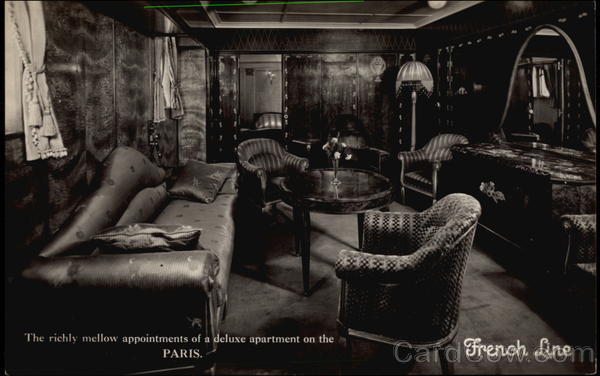 Front: The richly mellow appointments of a deluxe apartment on the French Line PARIS. Back: The Garraway Company, Rutherford, New Jersey