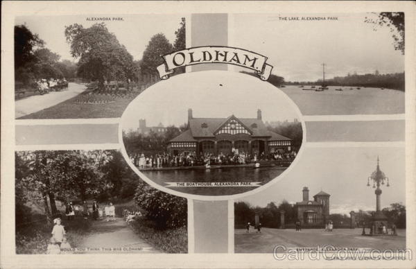 LDHAM. ALEXANDRA PARK, THE LAKE, ALEXANDRA PARK. LOLDHAM THE BOATHOUSE, ALEXANDRA PARK, WOULD YOU THINK THIS WAS OLDHAMP ENTRANCE, ALEXANDRA PARK ALLEN & SONS. OLDHAM & BLACKPOOL