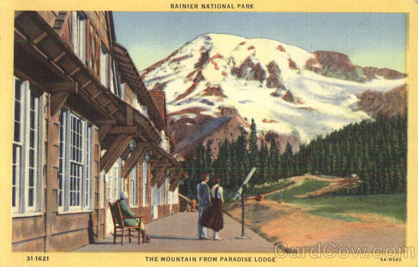Front: RAINIER NATIONAL PARK 31-1621 THE MOUNTAIN FROM PARADISE LODGE 6A-H582 Back: RAINIER NATIONAL PARK CO., TACOMA, WASH National Park, Washington. showing the mighty Nisqually Glacier. Rainier A vista from the porch of Paradise Lodge