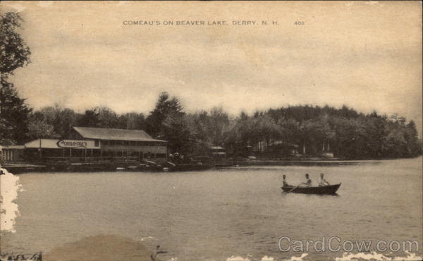 Front: COMEAU'S ON BEAVER LAKE, DERRY, N. H. 402 Comeau's Back: EAS UNITED STATES OF AMERICA INDUSTRY-AGRICULTURE tope you JUN 3- 14 1943 A.M. NH Hratte a Hanka FOR DEFENSE well! Meldhed , AMERICAN ART POST CARD CO., BOSTON, MASS Rogaltar Vermont