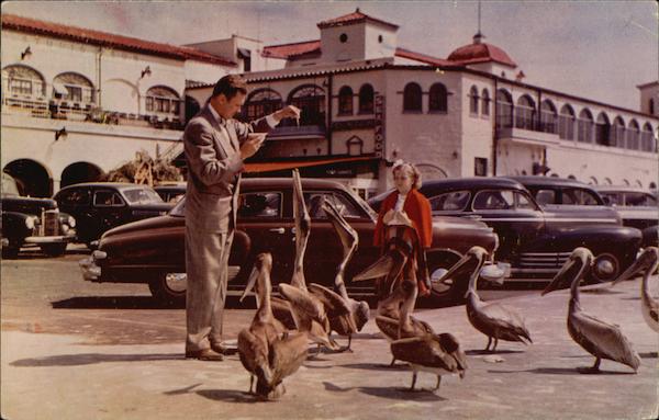 A tourist feeding the pelicans on the