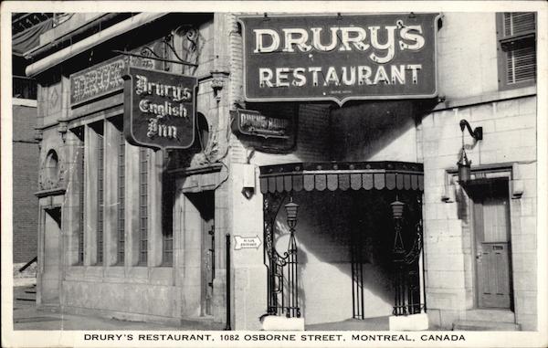 Front: DRURY'S 11 RESTAURANT Brurys English In DINGNG 1084 ENTRANCE DRURY’S RESTAURANT, 1082 OSBORNE STREET, MONTREAL, CANADA Back: Drury's Restaurant 250 1082 OSBORNE ST., ON DOMINION SQUARE MONTREAL, CANADA Established 1888 4390-31 IN CANAOP