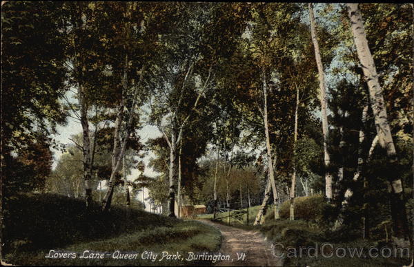 Front: Lovers Lane -Queen City Park, Burlington, Vi. Back: JA 99 100 Card. Place the ONE CENT for : United S.ates, and; Island Possessions Cuba, Canada and Mexico. No. 20014. The Hugh C. Leighton Co., Manufacturers, Portland, Me., U. S. A.
