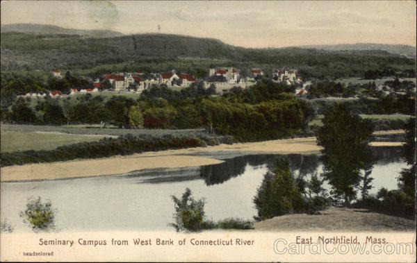 Front: Seminary Campus from West Bank of Connecticut River East Northfield, Mass. handcolored Back: Alice Heath Warren le #3- Mrs. MAT 309 hat noon! Morhen havingle to ra time in very rest Larsed A. 801A. The Bookstore, East Northfield, Mass.