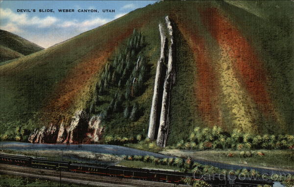 | Stretching imagination was not required to name this outcropping of porphyry, Devil's Slide, rising from the water below and extending far up the side of the mountain in Weber's Canyon, near Echo. The two limestone reefs are 20 feet apart and stand out 40 feet from the general slope of the canyon side |