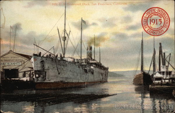Front: MY TRANSPORT SERVICE PERNAra 1051 U. S Transport Dock, San Francisco, California, ************* SHERNAL PACIFIC FWENYA INTERN 1915 CALIFORNIA EXPOS AL 1 Back: BRITTON & REY, LITHOGRAPHERS, S.F. PUBLISHERS OF PICTORIAL POST CARDS. TWO CENTS