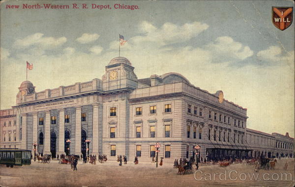 Front: New North-Western R. R. Depot, Chicago. 177 m!!!! CHICALO & NORTH WESTERN RAILWAY. AVALIN [FIEL WILL 11 Back: 124C AND CANADA, FOREIGN, Two CENTS.