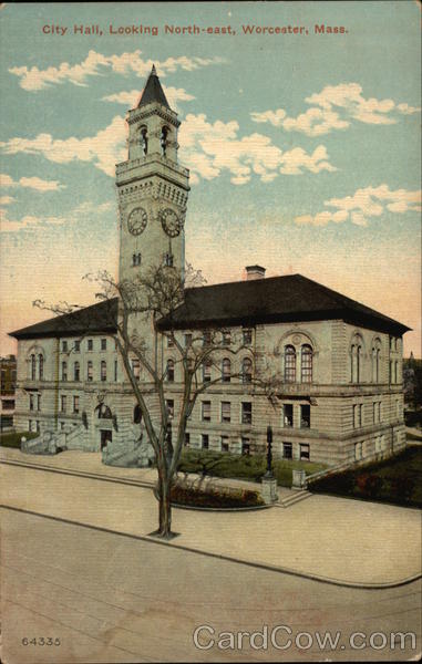Front: City Hall, Looking North-east, Worcester, Mass. 64335 Ved CE ZVANA M Back: J. I. Williams, Publisher, Worcester, Mass. THROUGHOUT TRADE MARK. &T QUALITY FAMOUS HE WORLD CARD