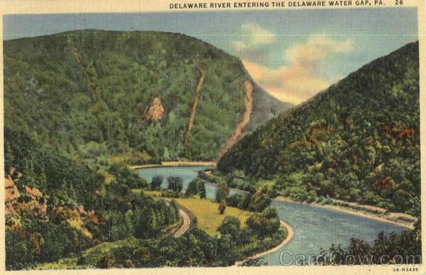 Front: 26 DELAWARE RIVER ENTERING THE DELAWARE WATER GAP, PA. 5A H 2436 Back: 25. “C.T. ART-COLORTONE" REG. U.S. PAT. OFF. MADE ON LY BY CURT TEICH & Co., INC., CHICAGO A. B. WYCKOFF, STROUDSBURG, PA. JL