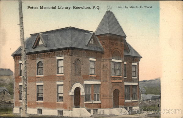 Front: Pettes Memorial Library, Knowlton, P.Q. TATT 1600514 TE 93 Photo by Miss S. E. Wood Back: This space may be used for Communication here