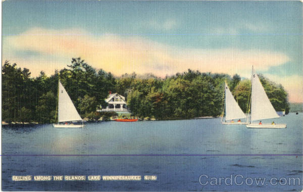 Front: SAILING AMONG THE ISLANDS. LAKE WINNIPESAUKEE. NH Back: 44143 11 These boats are members of the Winnipesaukee Yacht Club and were leading Club race at time picture was taken. COURSE Pub. by G. A. Quimby, Lakeport, N. H. اول داخلها ليا MU