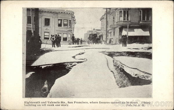 Front: 70 70 11 Eighteenth and Valencia Sts., San Francisco, where fissures opened up in street. 3 Story building on left sunk one story. Pub. by A. H. Back: CALIF-DISASTER - 4.00 PLACE THE HERE