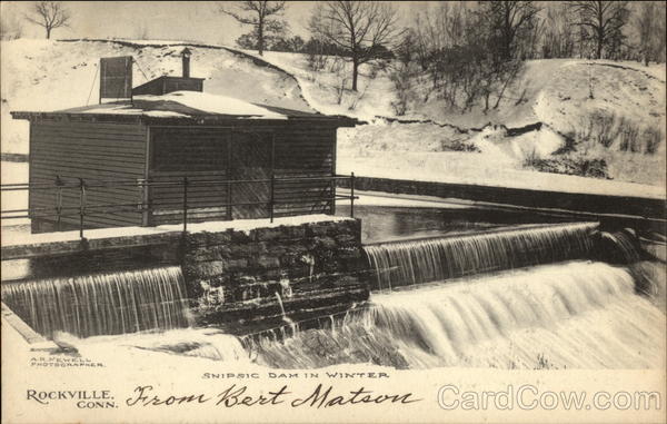Front: A.R.NEWELL PHOTOGRAPHER, SNIPSIC DAM IN WINTER ROCKVILLE, From Bert Matson CONN. St Back: 10.00 Domestic 1 Ct. Foreign 2 Cts. THE ALBERTYPE CO.! BROOKLYN, N.Y. Mrr. Angie A. Baker, Crystal Lake, Conn,
