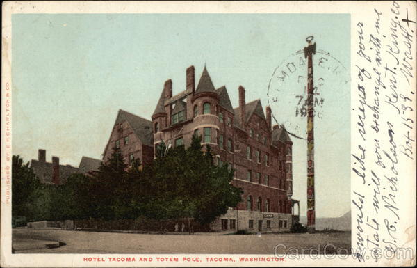 HOTEL TACOMA AND TOTEM POLE, TACOMA, WASHINGTON.