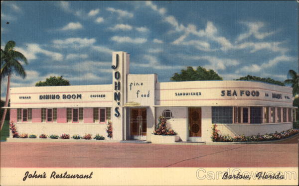 Front: fine food SEA FOOD s NR SANDWICHES DINING ROOM CHICKHER STEARS CONDITIONS Johns Restaurant Bartow, Florida Back: A-COLOURPICTURE" PUBLICATION, BOSTON 15, MASS., U. S. A. K2653