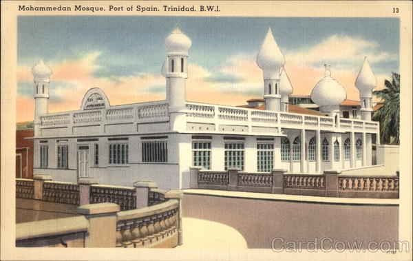 Front: Mohammedan Mosque, Port of Spain, Trinidad. B.W.I. 13 JAMA MAS wwww 77767 Back: T 7 "TICHNOR QUALITY VIEWS" REG. U. S. PAT. OFF. MADE ONLY BY TICHNOR BROS., INC., BOSTON, MASS. PUB. BY Y. DE LIMA & CO., LTD., PORT OF SPAIN, TRINIDAD, B. W. I.