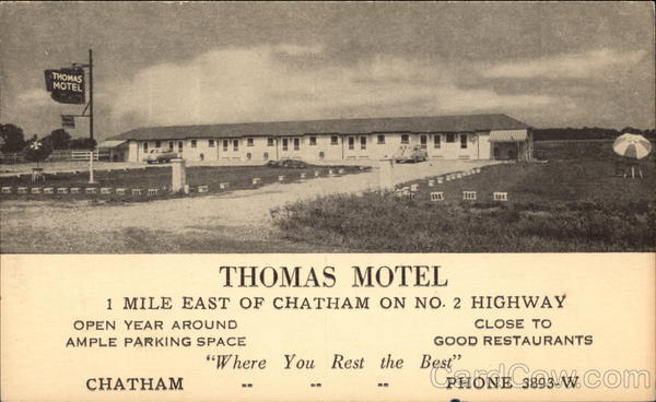 Front: THOMAS THOMAS MОТEL 1 MILE EAST OF CHATHAM ON NO. 2 HIGHWAY CLOSE TO OPEN YEAR AROUND GOOD RESTAURANTS AMPLE PARKING SPACE "Where You Rest the Best" PHONE 3893-Ν CHATHAM t目 Back: Message May Be Written On This Side
