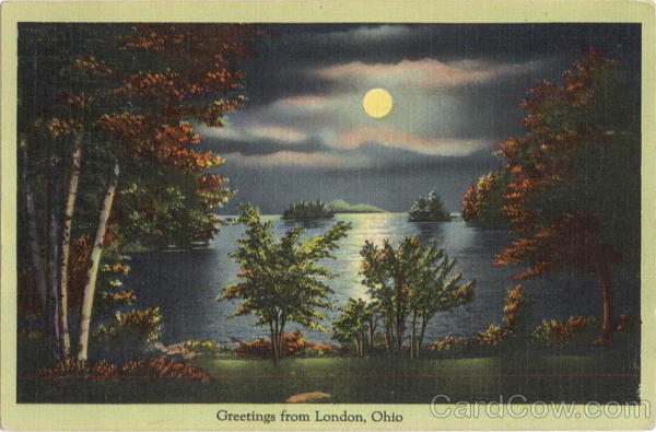 Front: Greetings from London, Ohio Back: MADE IN U.S. A 500 "TICHNOR QUALITY VIEWS REG. U.S. PAT. OFF MADE ONLY BY TICHNOR BROS. INC., BOSTON, MASS. 63481 MOONLIGHT SCENES - 5 SUBJECTS