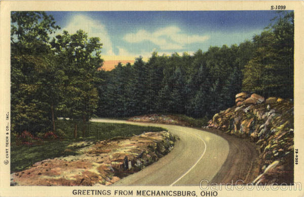 Front: S-1099 GREETINGS FROM MECHANICSBURG, OHIO C CURT TEJCH & CO., INc. 73-H309 Back: c. T. ROAD SCENES-10 SUBJECTS 25