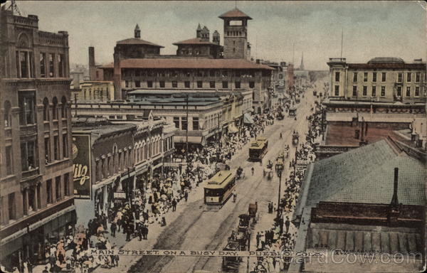 Front: W CE 344 itz PEER PANDUS BAR SWITH BRUGS MAIN STREET ON A BUSY DAY, ORIEN FA PUEBLO. COLO. 5.23. WINCH SHAYDE TATIONERY CO, HAND-COLORED Back: 9-12+2 3- DOMESTIC, 1c FOREIGN, 2c. THE ALBERTYPE CO. BROOKLYN, N. Y.