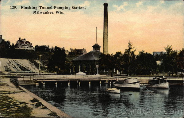 Front: 129. Flushing Tunnel Pumping Station, Milwaukee, Wis. Back: MADE IN U.S. A. E. A. BISHOP, PUBLISHER, RACINE, WIS. MESSAGE MAY BE WRITTEN ON THIS SIDE. A-16296 Place the Stamp Here; and Island Possessions Cuba, Canada and i For Foreign. 1