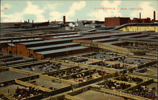 The Union Stock Yards is the largest live stock market in the world, containing about 500 acres. In these yards are received an average of 1,000 cars of livestock daily. Cattle are detained in these pens for a period of one to two days before being driven to the slaughter house |