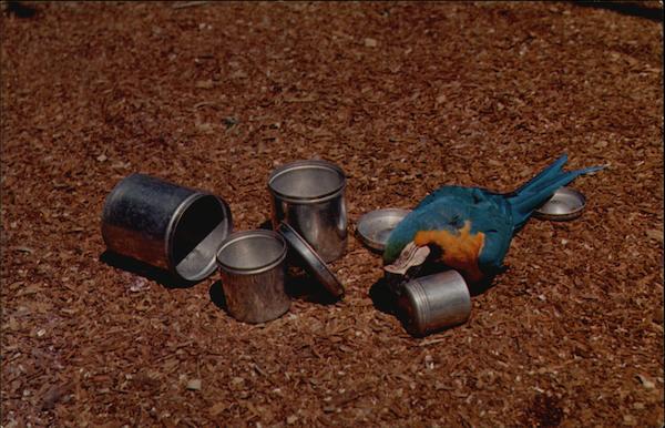 Wimpy, a blue and gold macaw has been trained to open a canister set, with the cans placed up-side down inside of one another. He opens them can by can to enjoy a peanut or grape buried in the smallest. Wimpy is one of the star performers in hourly shows at Miami's famous Parrot Jungle |