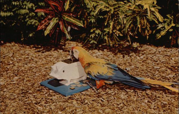 MIAMI'S BEAUTIFUL PARROT JUNGLE "BONINO", PERFORMING MACAW AT G.52-GULF STREAM CARD & DISTRIBUTING CO., MIAMI, FLORIDA CURTEICHCOLORⓇ3-D NATURAL COLOR REPRODUCTION (REG. U. S. A. PAT. OFF.) 1DK-1974 PLACE