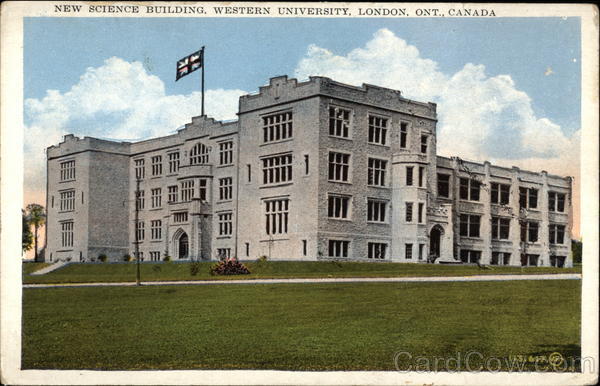 Front: NEW SCIENCE BUILDING, WESTERN UNIVERSITY, LONDON, ONT., CANADA 區間車 W 1 ISS 113.647 Back: Published by Valentine-Black Co., Ltd., Toronto, Canada. FAMOUS POSTV & SONS 75