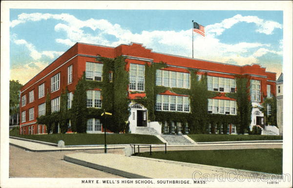 Front: FA MI MARY E. WELL'S HIGH SCHOOL, SOUTHBRIDGE, MASS. LLL 108191 Back: PUBLISHED BY AMERICAN ART POST CARD CO., BOSTON, MASS. C. T. AMERICAN ART COLORED 19 HERE