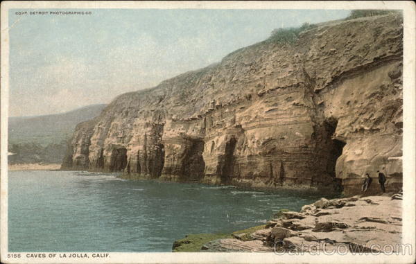 Front: COPP. DETROIT PHOTOGRAPHIC CO. 5155 CAVES OF LA JOLLA, CALIF. Back: MADE ONLY BY DETROIT PUBLISHING CO. "PHOSTINT" CARD. TRADE MARK REG. U. S. PAT. OFF. /25 THIS SPACE MAY BE USED FOR MESSAGE. AND CANADA. FOREIGN. TWO CENTS