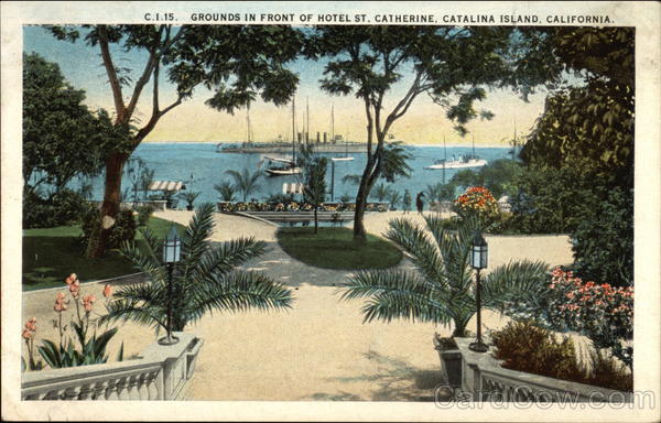 Front: C.I.15. GROUNDS IN FRONT OF HOTEL ST. CATHERINE, CATALINA ISLAND, CALIFORNIA. Back: LOS ANGELES, CAL WESTERN PUBLISHING & NOVELTY CO A-91797 AND ISLAND POSSESSIONS, CUBA, CANADA AND MEXICO FOR FOREIGN