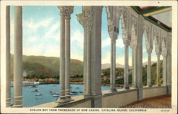 Front: ***** 180104 AVALON BAY FROM PROMENADE OF NEW CASINO, CATALINA ISLAND, CALIFORNIA 6578 3214-29 Back: Catalina Island, California. N 95 100 "In All The World No Trip Like This" C. T. AMERICAN ART COLORED TE HERE