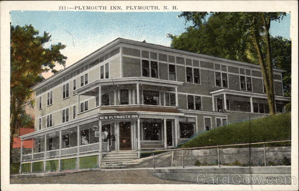 Front: 211: PLYMOUTH INN, PLYMOUTH, N. H. NEW PLYMOUTH INN 30167 Back: White Mountain Letter Co., Plymouth, N. H. Publishers of Post Cards and Folders. HADEMUSA WILD Place the Stamphere and Island Possessions Cuba, Canada and for foreign.