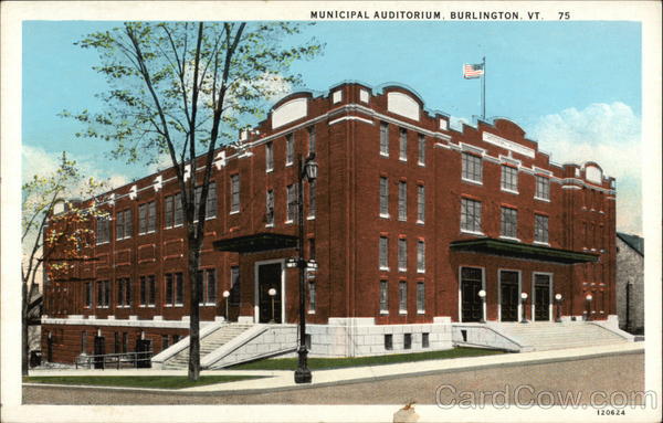 Front: MUNICIPAL AUDITORIUM, BURLINGTON, VT. 75 120624 Back: PUBLISHED BY C. W. HUGHES & CO., INC., MECHANICVILLE, N. Y. STAR QUALITY C. T. AMERICAN ART COLORED 1. TE CHICAGO HERE