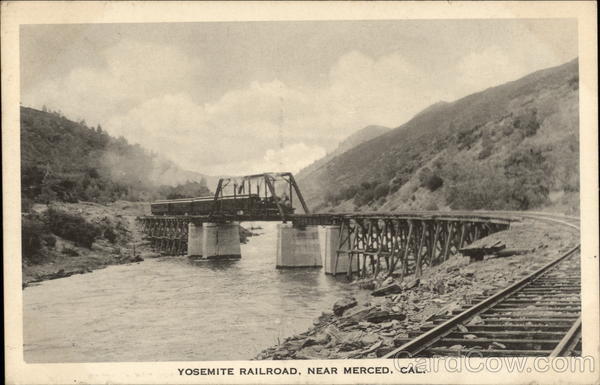 Front: YOSEMITE RAILROAD, NEAR MERCED, CAL. Back: 24/1 - 26/1 Post Cards of Quality. The Albertype Co., Brooklyn, N. Y. THIS SPACE FOR ADDRESS.