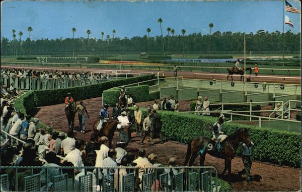 | At Hollywood Park the thoroughbreds are saddled in a paddock in front of the stands so every spectator may see the interesting last-minute activity before each race. For those who like a close-up view of the pre-race action before owners and trainers send horses with their jockeys out on the track, there is a paddock amphitheatre that accommodates 3,500 patrons |