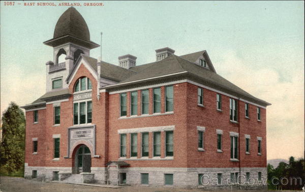 Front: 1087 - EAST SCHOOL, ASHLAND, OREGON. EAST SIDE SCHOOL FE CEEEE UT 11 11 TU!! Back: Post Card- EDWARD H. MITCHELL. PUBLISHER, SAN FRANCISCO, THIS SPACE FOR ADDRESS ONLY