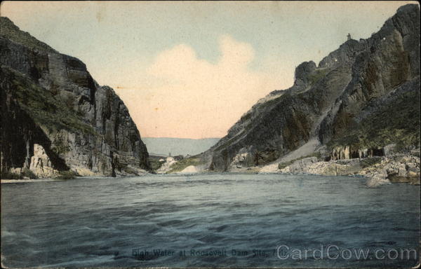Front: Figh Water at Roosevelt Dam Site, Ariz. PER Back: M. Rieder, Publ., Los Angeles, Cal. 20112. A message may be written in this space handcolored work The Lubkin Co., Mesa, Arizona. ¡Domestic sessions 1 ci Mexican 2 c