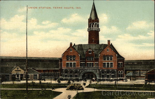 Front: UNION STATION, TERRE HAUTE, IND. 14 111 Back: USLOSTAGE POST CAR -h Harris 2:4 митив Feb 1-1910 Please send in return view to а выйти всена Б Mrs. Della Moore Insore Farmersburg prop Made expressly for S. H. Knox & Co.