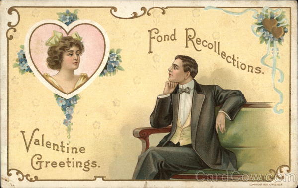 Front: Valentine Greetings. 26 Fond Recollections ES COPYRIGHT 1910 H. WESSLER. Back: 537 by car is not very well How be of hope you your Esther. Post Cod 12 M 12 FEB 1912 Pa Mat Miss Mary Farget. Seward Nels, U