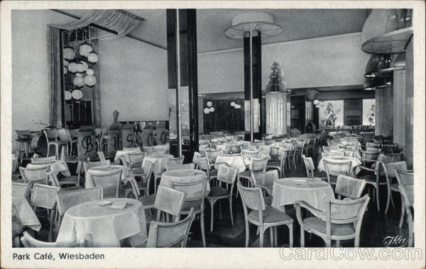 Front: BY USE CO Park Café, Wiesbaden Tha Back: Park Betriebe Wiesbaden, Wilhelmstr 36 Fernsprecher 28033 u. 28716 Kunstverlag J. Kalinowski, Düsseldorf, Ruf 63832