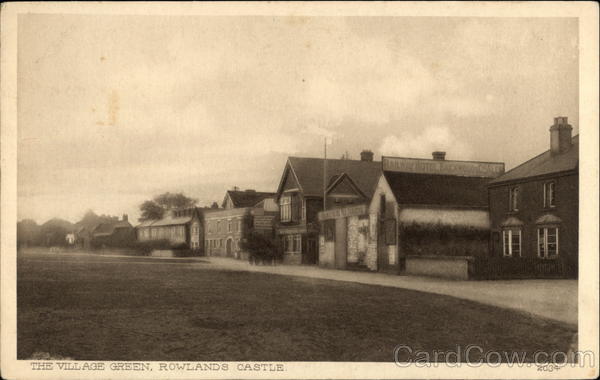 Front: THE VILLAGE GREEN, ROWLANDS CASTLE. RAILWAY HOTEL BRICKWOOD TE TE 2034 Back: 2034. B. & H. Rook, The Post Office, Rowlands Castle, S.H. Hants. Halfpenny to be placed here