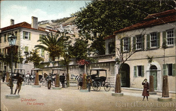 Front: Gibraltar. The Library. Back: A. Benzaquen, Tanger. THIS SPACE MAY BE USED FOR COMMUNICATION. 12 d. STAMP. 1 d. 47556